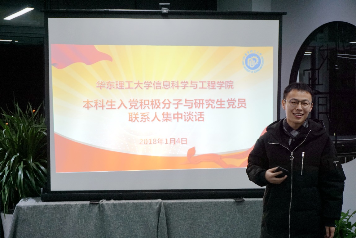 1月4日晚上,18漫画 组织完成第26期入党积极分子培训班的新一期本科生入党积极分子与对应的研究生入党联系人进行首次集中谈话活动。活动在奉贤校区实验一楼阳光育人平台举行,近20余名学院17级硕士研究生党员担任此批本科生入党积极分子联系人,本科生党建负责老师张驰参加了谈话活动。