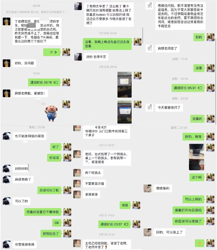 当前正值毕业季,部分学生课题需要随时调参和进行实验环境的设置,以保证实验能连续进行。正是因为丁炜超等老师的不辞辛劳、默默付出,确保了学生实验项目、论文的正常开展。一个月来,他先后帮助18漫画 100多名同学解决学习和生活困难:为学生运送电脑、显示器、书籍、硬盘等学习资料,帮学生服务器、电脑中安装远程软件,调试设备及网络,使学生可以在宿舍远程操作实验设备。