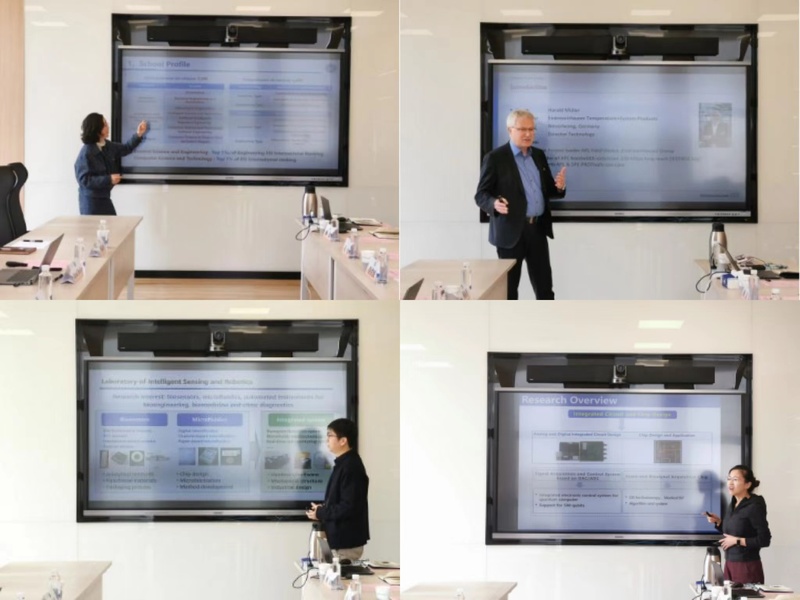 教师代表卢静宜、顾震、孙丽华分别介绍了课题组团队的研究方向,双方进行了深入的交流和讨论。双方着重讨论了在当前智能制造和数字化转型的大背景下,如何加强校企之间的科技创新合作,提升学生的实践能力和创新意识。
